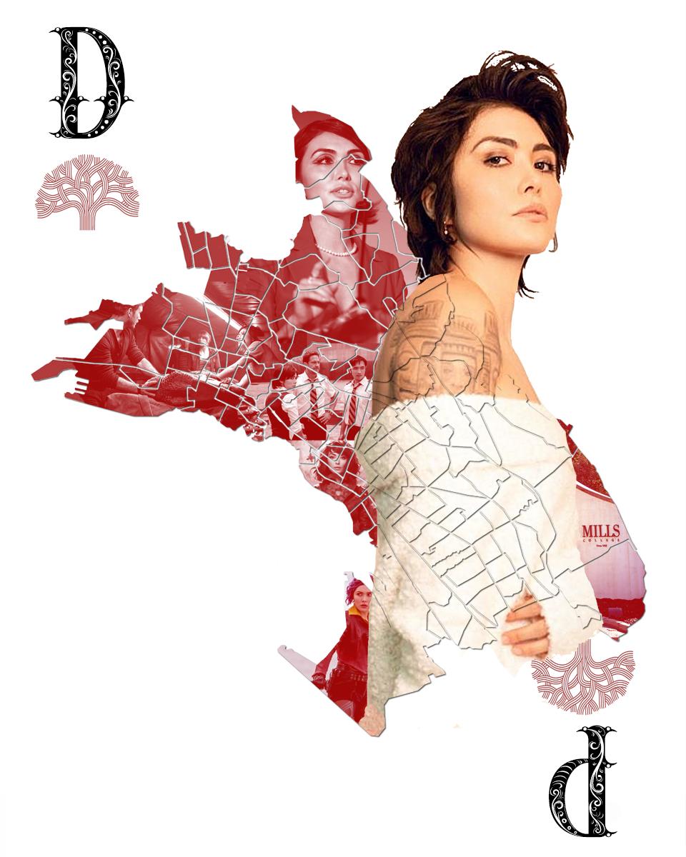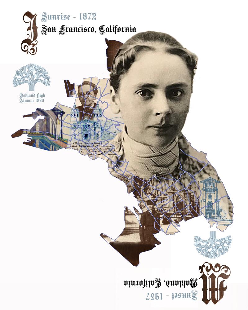 1) Under the top Oakland logo references her as an Oakland High Alumni graduate of 1890 2) The main portrait is Julia Morgan in 1890 around the time she graduated from Oakland High 3) To the left of the main portrait is her in her elder stage. I'm not sure the exact age 4) underneath that portrait is her illustration of one of her most famous buildings designed - The Hearst Castle in San Simeon, Ca. 5) To the left of that is a watercolor sketch of her building design, the Berkeley City Club with the well known swimming pool section 6) Direct beneath her main portrait is her at the famous École des Beaux-Arts in Paris. She was the first woman admitted to the prestigious architecture program and graduated. and she was the first licensed female architect in the state of California 7) Is her sketch of the 72-foot bell tower at Mills College, El Campani. It was her first reinforced concrete structure, was constructed in 1904 — and just two years later, famously survived the 1906 San Francisco earthquake unscathed. She was the earliest or one of the earliest architects to use concrete reinforced structures.