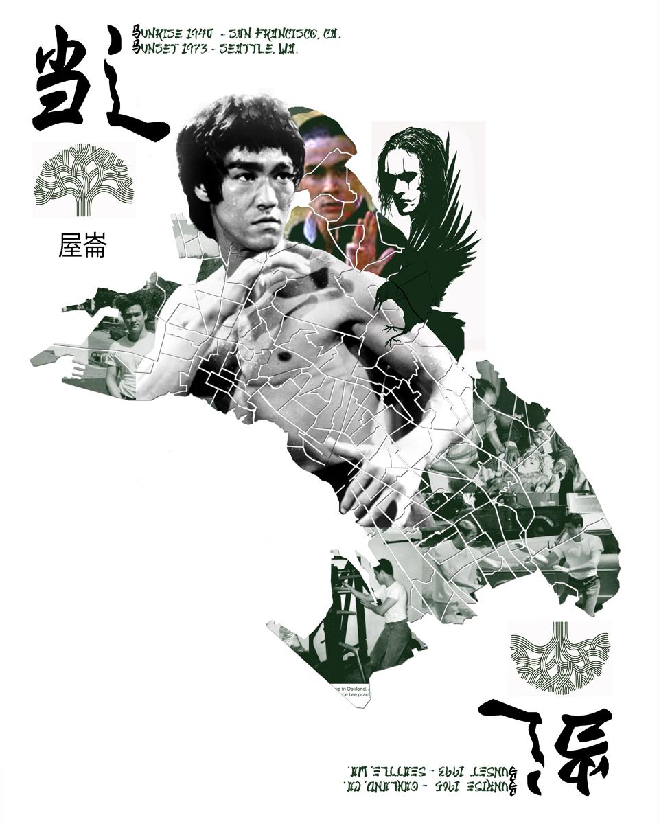 1) Under the top Oakland logo is Oakland translated in Chinese Traditional 2) The main portrait is Bruce Lee in one of his famous films, Enter the Dragon. During this film and where he died at the age of 32, due to allergic reaction to some pain medication 3) To the left is a picture of him at 4 months old in his first acting career playing a baby girl in a SF based filmed called "Golden Gate Girl" in 1941 4) At the bottom is a picture of him in front of his friends house on Monticello Ave in East Oakland by Mills College where he began his martial arts training class. 5) At the top left is a picture of Brandon Lee in color next to his father Bruce Lee. To the right of Brandon Lee in color is a black and white image of one of his most famed characters from the movie - The Crow 6) The calligraphy style BL at the top left is for Bruce Lee and his birth and death information. 7) At the Bottom Right is a calligraphy BL upside down for Brandon Lee with his Birth and Death information.