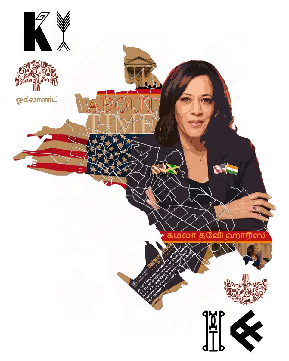 1) To the right of the K at the top is the Nsibidi (historic Nigerian protowriting) which means Root. Take the small little inverted V at the bottom out and it would mean tree. In this case both apply as it implies Kamala is rooted in Oakland, as a person born in this city, the tree is also referenced as Oakland's logo and name 2) Under the Oakland tree at the top is Oakland translated in Tamil which is the language VP Kamala Harris' mother spoke. 3) On the flip side or inverted right end is K translated in Wakandan Script (created by Academy Award production designer, Hannah Beachler from the Black Panther movies as a derivative of an actual North African language) To the left of it is the word Country in Nsibidi flipped upside down 4) To the left of Kamala's head at the top of the Oakland map, is the White House 5) The center portrait of Kamala is a derivative of her on the cover of Time Magazine with a posterize style to look like a campaign or political poster b. To the left of her it say's "About Time" a pun to the Time portion of the Magazine indicating that it is about Time we have a Vice President of the United States that is a woman and woman of color, both Black and South East Asian, etc. 6) American Flag to the right of her to represent her national public servant. 7) She has two flag pins that represent two of her main racial background; Jamaican (Father) and East Indian (Mother). 8) Directly beneath her main portrait is her name in orange translated in Tamil which is Kamala Devi Harris from right to left 9) In the bottom right corner is Kamala as newly elected VP of the US in front of our Oakland City Hall. 10) In the bottom left corner are two images of the same subject, Kamala's tweet about starting Back On Track, a pilot program she started as DA of San Francisco to help reduce recidivism rate among youth and non felony offenders and provide programs for them to successfully return to society and not back in jail. Something a lot of her critics don't bring up much. Back On Track LA is the program years later still making progress.