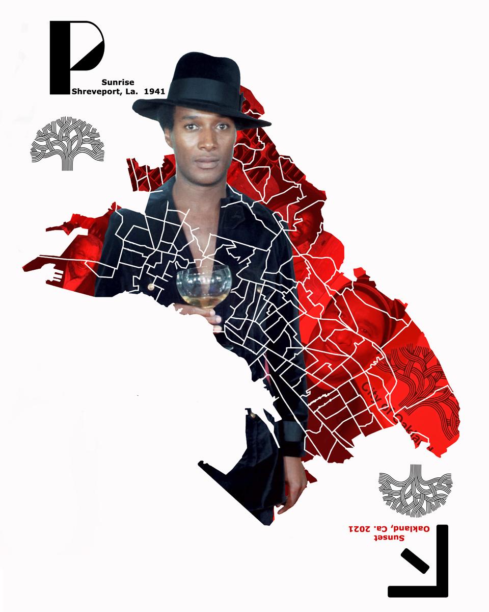 1) The main image is a portrait of Paul Mooney in his early years coming out of the map of Oakland 2) In the Background you would see promo pictures of Sanford and Son which he co-wrote for two episodes 3) In the background inside the map in the lower right corner is Paul Mooney's proclamation from the City of Oakland, Ca. 4) In the top left corner is his first initial with his birth and death date and place 5) In the bottom right corner is his first initial translated in Wakandan script with his birth and death date and place