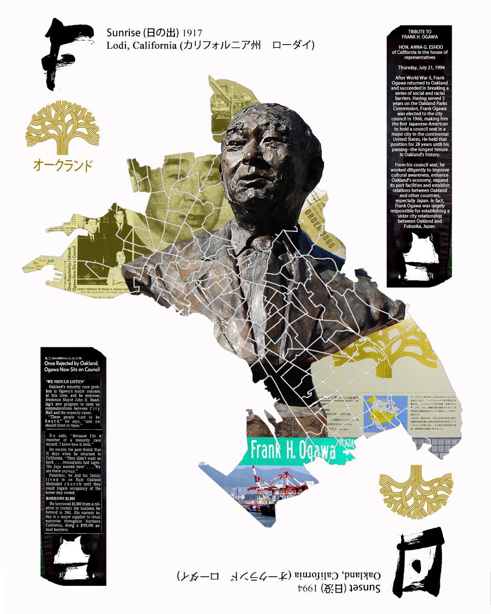 1) Very top is the Port of Oakland in which he was instrumental in strengthening a connection with the world. 2) Top left is a collage of newspaper articles of Frank Ogawa with his family as he becomes City Councilman of Oakland. From the same article is a header about him and other Japanese Americans being discriminated against after WWII and the Japanese Internment period. In the far left corner next to the article is a map of Lodi, California his hometown and the Bay Area cities indicating the irony of interning American born Japanese who had nothing to do with the "Attack on Pearl Harbor" 3) At the far right end over his shoulder if the Executive Order 9066 that intern Japanese Americans across the US 4) Lower right is a shot I took in 2012 in Fukuoka, Japan's City Hall that has the City of Oakland logo in their basement with a map of Oakland and description in Japanese 5) DIrectly below his bust is the street sign for Frank H. Ogawa Plaza 6) The bust itself is a a twin bust as the 2nd one is in the Port of Hakata (old name for Fukuoka, Japan) as you can see in the attached picture in this email of me with my host family and friends in Fukuoka, Japan in April 2012. That is why most of Fukuoka is referenced on the lower end of the bust. 7) At the very bottom, at the exact opposite end of the Port of Oakland is the Port of Hakata with similar cranes to the Port of Oakland 8) The two tassel-like panels are the articles embedded into the map that people can read. They are a subtle reference to the black text panels next to the Frank H. Ogawa bust in the plaza about Frank.