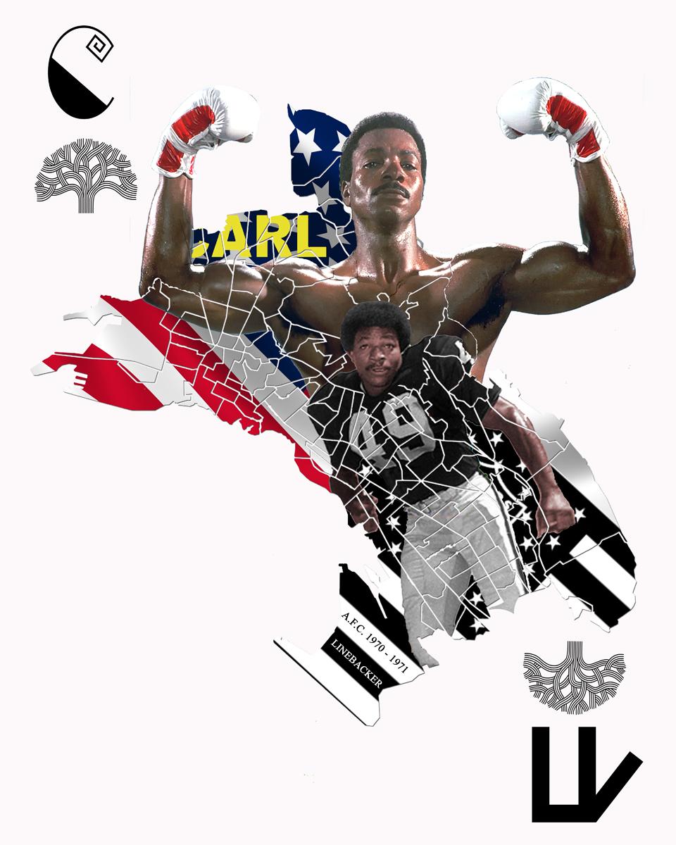 1) The main image is a promo picture of Carl Weathers in his most iconic character he is known to play, Apollo Creed of the Rocky movie series. This is from Rocky IV the most famous one 2) Underneath that is a picture of Carl Weathers in his first professional career as a free agent linebacker for the Oakland Raiders in 1970 that helped lead the Oakland Raiders to an A.F.C. Championship which is referenced in the lower left corner of the Oakland map in black and white 3) His initials C is in the upper left corner and his last initial W is inverted in the lower right corner of the picture.