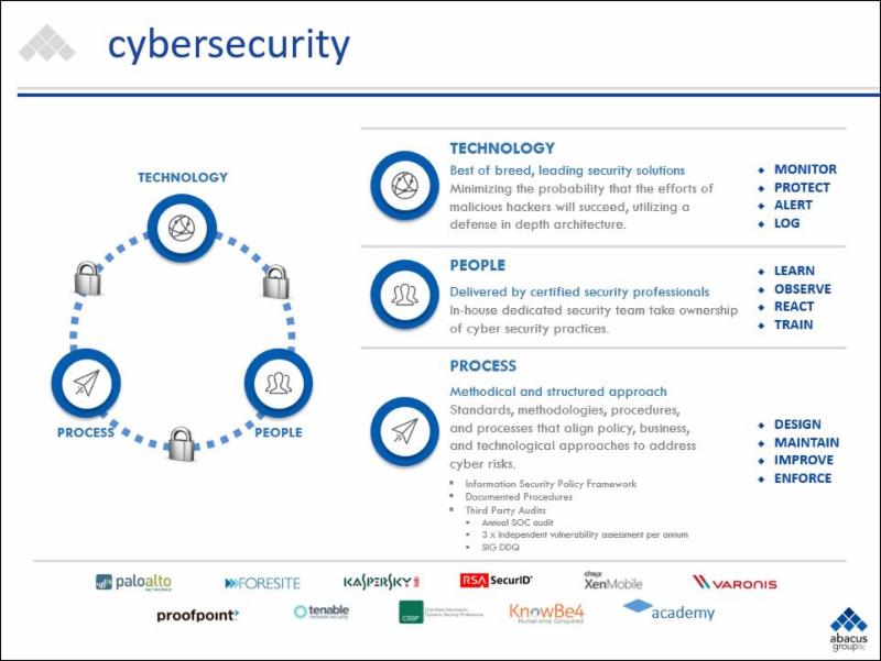 Security continues to be a focus for Abacus and 2016 was no different. Our strategic initiatives included several security enhancements that add further value to the trust that our clients put in us to manage their systems and data. First and foremost, we increased the size of our security team, adding capacity to deal with the demands of cybersecurity requirements. Other projects included:
