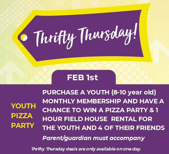 Purchase a youth monthly membership and have your name entered into a draw for a chance to win a pizza party and 1 hour field house rental for the youth and 4 of their friends.