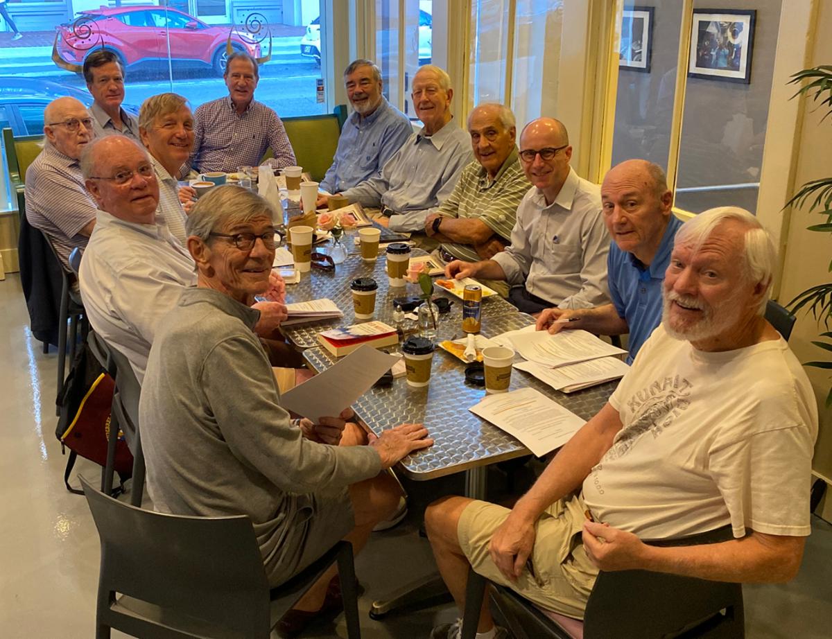 The CBD Study Group recently finished their spring 2024 season with a study of The Sabbath by Abraham Joshua Heschel. The group, which meets on Wednesdays at 8 a.m. at Bittersweet Confections, 725 Magazine Street, is on summer break now and will reconvene in August to study An Infinite Fountain of Light: Jonathan Edwards for the Twenty-First Century, by George Marsden. All are welcome! Contact Larry Hamric at l.m.hamric@att.net with any questions. Pictured here clockwise from foreground left are Neale Miller, Ken Kneipp, Don Frampton, Ed Lupberger, Michael Bell, David Grissett, Larry Hamric, Michael O'Keefe, Jim Bean, Robert Edgecombe, Clif Rhodes, and Richard Ashmore.