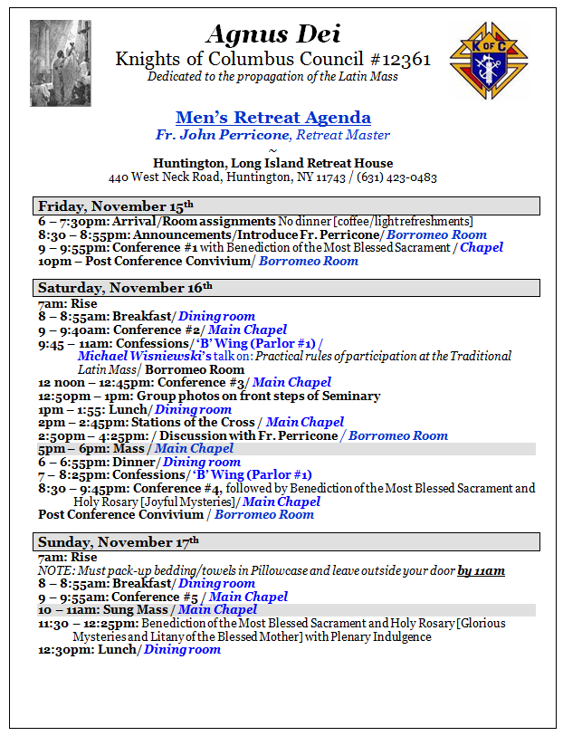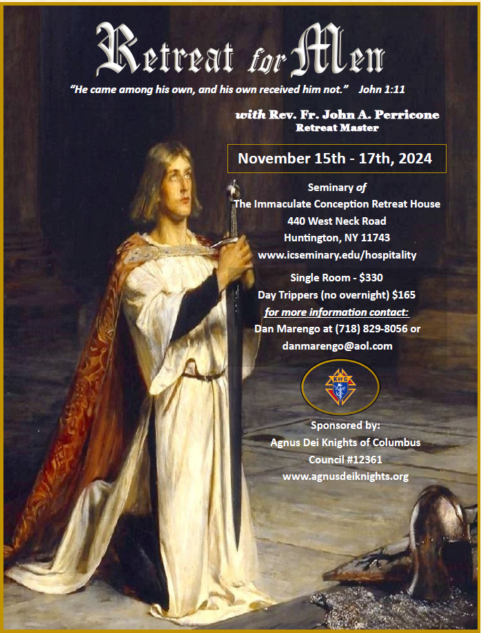 Reservations for the annual Men's Retreat is scheduled for Nov. 15-17 at the Seminary of the Immaculate Conception in Huntington, L.I. is now open. The Retreat Master is Fr. John Perricone and is sponsored by Agnus Dei Knights of Columbus Council. I usually take reservations starting in September, but since I expect a lot of reservations this year, please consider reserving a spot sooner rather than later.