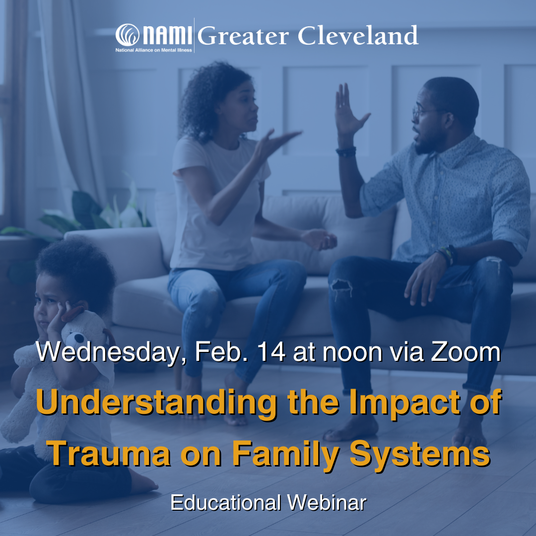 Family life comes with challenges and stress, and when ongoing distress, lack of resources, or tragic events occur, their impact extends to all family members. Understanding the signs, reasons, and basics of trauma's brain science is key to building resilience and aiding in recovery. Join NAMI Greater Cleveland on Wednesday, February 14, at 12 PM via Zoom for a session on Understanding the Impact of Trauma on Family Systems facilitated by Brian Strozewski, LPCC-S, CCAT, a professional clinical counselor and pyschoeducation presenter with NAMI Greater Cleveland, this presentation will provide an introductory overview of trauma on family systems. Additionally, attendees will learn foundational brain science of stress, trauma, and resilience, and apply information to understand how trauma affects families and relationships and what can be done to help families to be healthiest despite adversities.