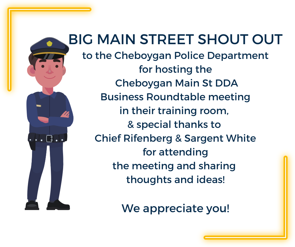 The Cheboygan Main Street Business Development Committee co-chaired by Carole Yeck (DDA board member and Executive Director of the Cheboygan Chamber) & John Stritmatter (DDA board member & downtown property owner) hosted a Business Roundtable meeting. This meeting was held in the the Cheboygan Police Department Training Room. Over 20 downtown business owners & staff attended. Main St DDA Director Polly Schneider shared upcoming and ongoing project/ programs that the Main St DDA board and committees are working on, an overview of each of the four Main St committees and partnerships that are collaborating to bring events, maintain downtown, and address areas of concern. Click here to view a summary of the roundtable meeting.