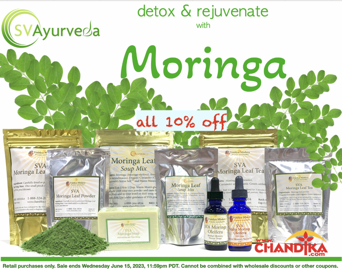 Moringa thrives where other plants and ingredients fail. Although the plant's many parts are used - leaves, flowers, seeds, fruit and even bark - in the Vedic tradition, the leaves and the fruit are particularly favored in cooking, for daily nourishment and detoxification, alone or with some lentils (mung or masoor preferably). SVA recommends using it daily for nourishment and detoxification because it is very effective in ridding the bone tissue of accumulated toxic waste. Since it targets the bone tissue, it is then also good for the blood and fat tissue - toxins travel through the blood, the muscle and then the fat before reaching the bone as one is built on the other. As a side-benefit, moringa also supports the detoxification of the liver. There are also some additional benefits to consuming Moringa on a regular basis: