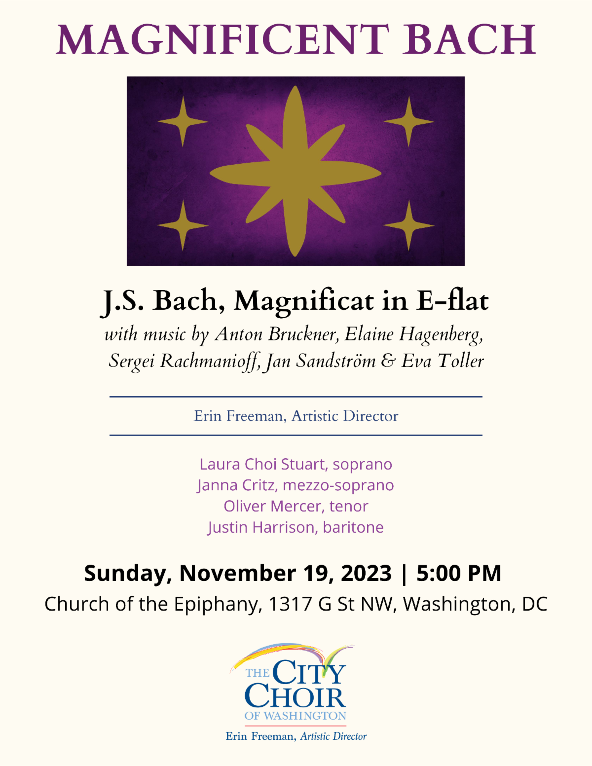 | | From the desk of Erin Freeman: To complement Bach’s E-flat Magnificat, the opening half of the concert takes inspiration from Bach’s four Christmas interpolations, pairing them with a cappella works from around the world. We open with the simple Ett barn är fött på denna dag, a traditional Swedish Christmas carol version of Vom Himmel hoch, first created in 1617, rewritten in 1817, and arranged in the 21st century by Eva Toller. Bach’s jaunty Gloria in Excelsis becomes Jan Sandström’s Gloria, a modern 13-part setting with a more prayerful interpretation of the text. Rachmaninoff’s Bogoroditse Devo connects to Bach’s “Freut euch und Jubiliert” with a shared call to “Rejoice.” City Choir couldn’t let Rachmaninoff’s 150th birthday pass without this most beautiful of odes to the Virgin Mary! Following is Bruckner’s Virga Jesse floruit—bold and organlike in character, it shares with Bach’s setting a joyously rhythmic Alleluia. Concluding the first half of the program is Elaine Hagenberg’s Alleluia, our most modern piece (2020) with the most ancient text (4th/5th century, by St. Augustine).