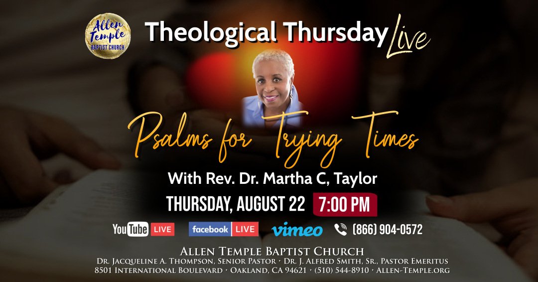 On Thursday, August 22 at 7pm, join us for the third installment in our Theological Thursday Live series - Psalms for Trying Times! This week's lesson will be taught by Reverend Dr. Martha C. Taylor!