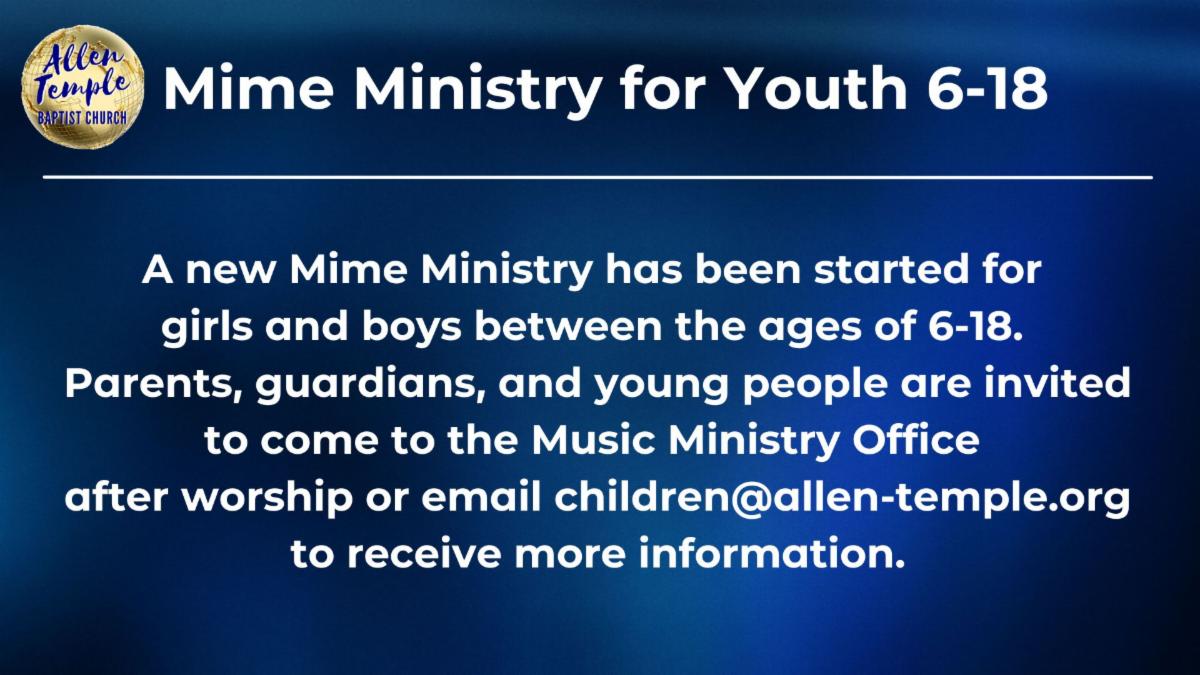 | A new Mime Ministry has been started for young people between the ages of 6-18, Parents, guardians, and young people are invited to come to the Music Ministry Office after worship to receive more information or email children@allen-temple.org. | | |