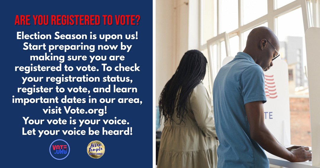 | Election Season is upon us. Start preparing now by making sure you are registered to vote. To check your registration status, register to vote, and learn important dates in our area, visit Vote.org. Your vote is your voice. Let your voice be heard! | | |