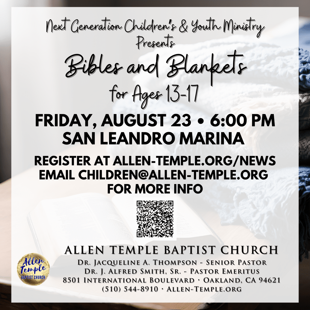 | The Next Generation Ministry invites young people between the ages of 13 and 17 to take part in their Bibles and Blankets event at the San Leandro Marina! To register your young person, click here. For more information, email children@allen-temple.org | | |