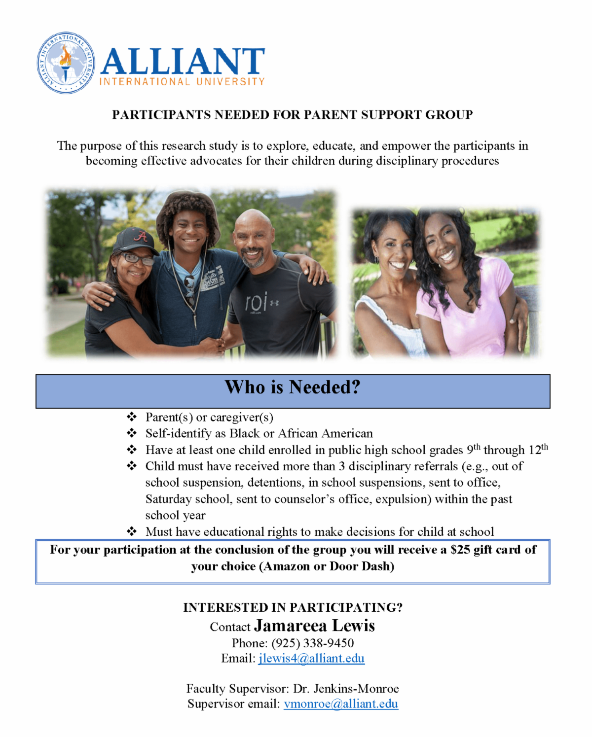 Interested in participating? Contact Jamareea Lewis (925) 338-9450 or jlewis4@alliant.edu