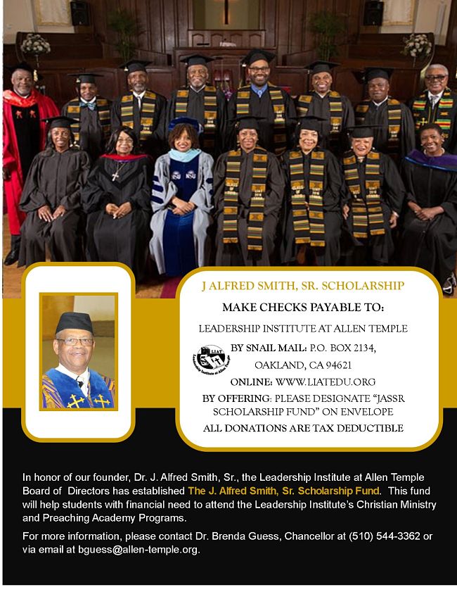 In honor of our founder, Dr. J. Alfred Smith, Sr, the Leadership Institute at Allen Temple Board of Directors has established the J. Alfred Smith, Sr Scholarship Fund! This fund will help students with financial need to attend the Institute’s Christian Ministry and Preaching Academy programs.