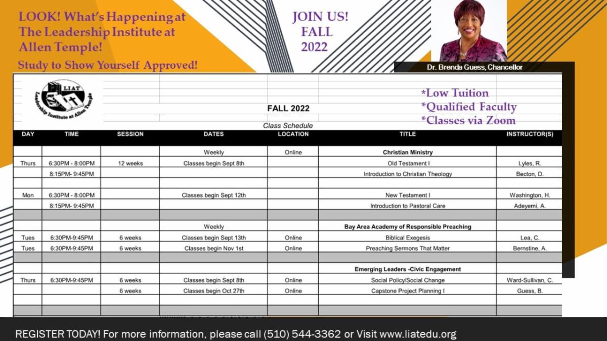 Study at the Leadership Institute at Allen Temple during the Fall semester! Courses begin this month! Engage in study on Christian Ministry fundamentals, preaching, emerging leadership and civic engagement.