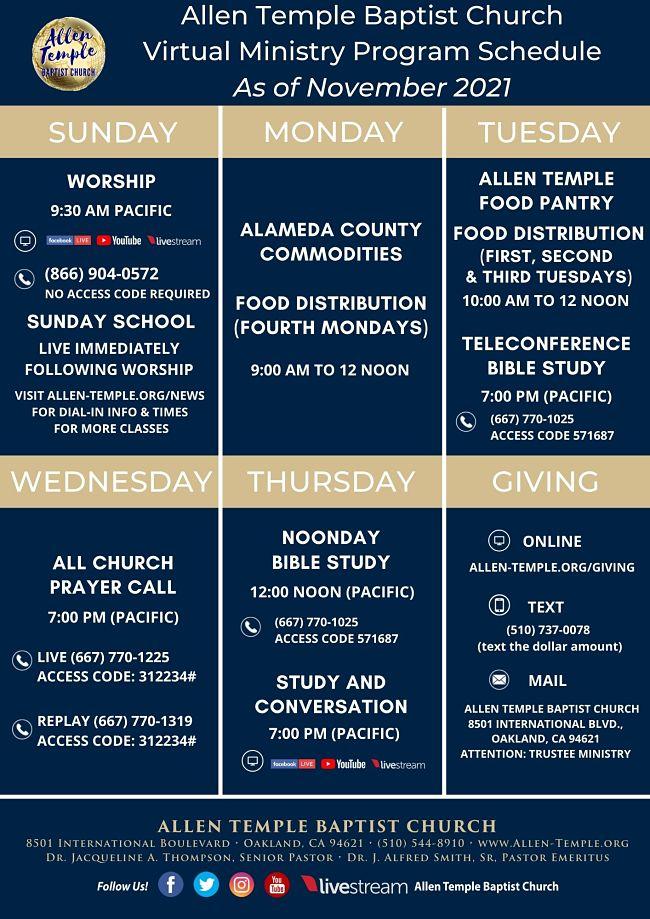 We invite you to join us throughout the week for virtual ministry experiences! We jalso have a new dial-in number for Sunday worship - (866) 904-0572 and new Prayer Call number! Download our Virtual Ministry Schedule and share with family and friends!