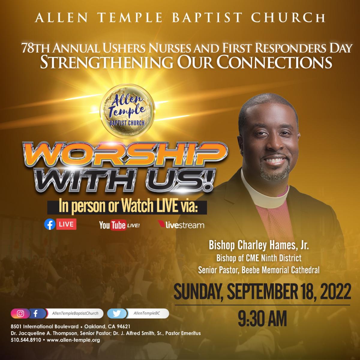 Worship with us this Sunday, September 18 at 9:30 AM! It’s our 78th Annual Ushers, Nurses, First Responders and Welcome Ministries’ Annual Day, and we’re honored and blessed to welcome back to the pulpit our friend in ministry, Bishop Charley Hames, Jr, Bishop of the CME 9th District and Pastor of Beebe Memorial Cathedral Oakland!