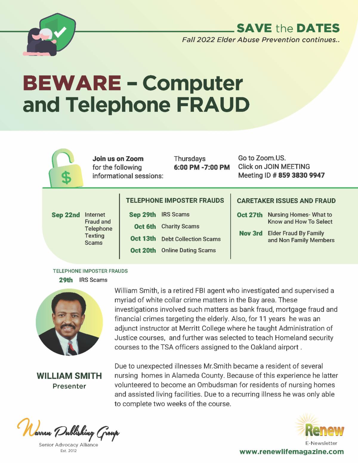 Join Warren Publishing Group and special guest William Smith (Retired FBI Agent) for seminars to educate on computer and telephone fraud. Join one of these sessions: