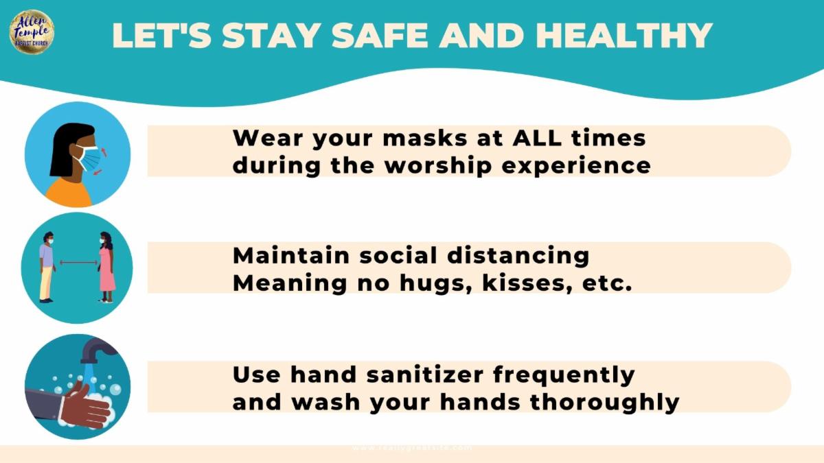 - Wear your masks at ALL times over your nose and mouth during the worship experience
