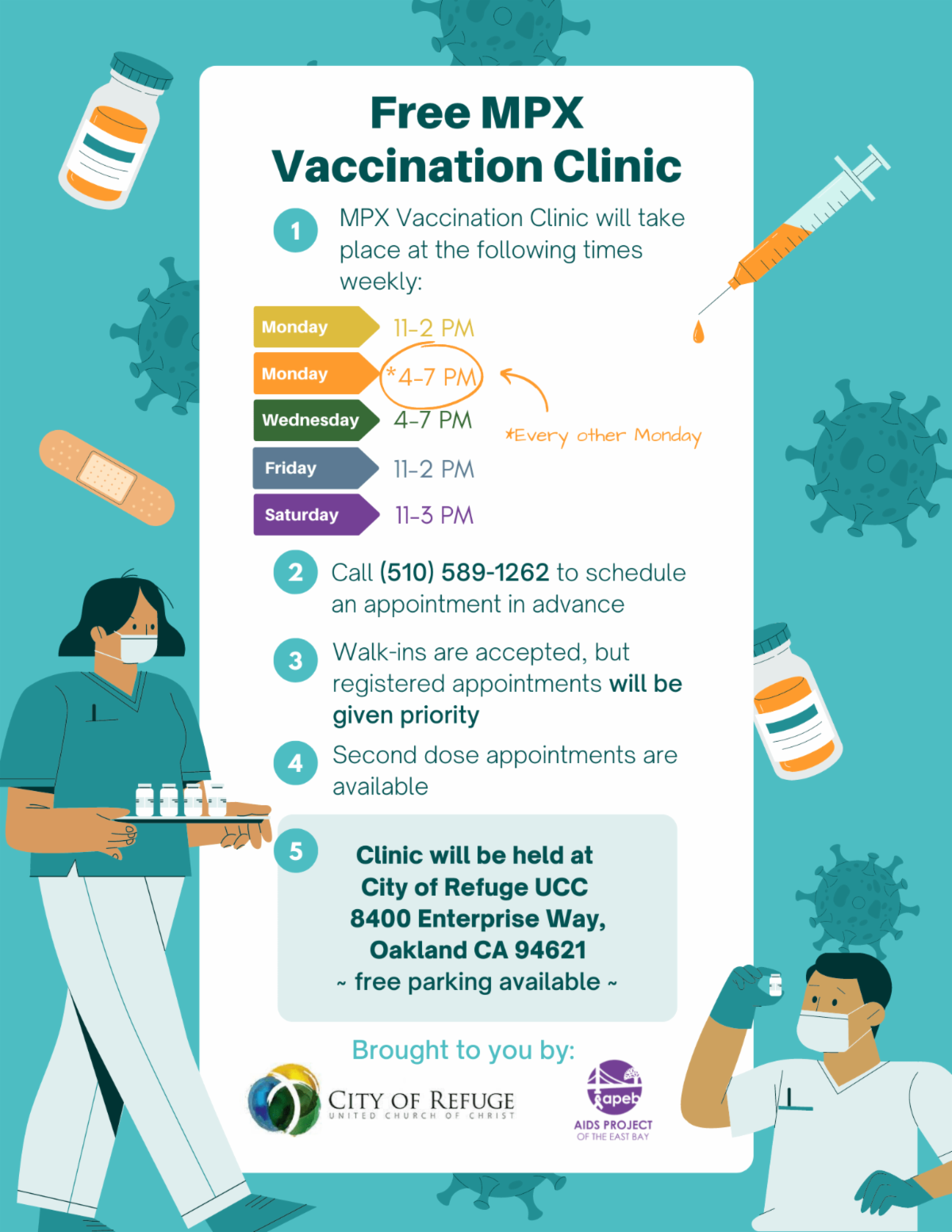 | City of Refuge United Church of Christ will be hosting a Monkeypox vaccination clinic at 8400 Enterprise Way in Oakland! See the image for days and times. Walk- ins are welcome; priority will be given to those with appointments. To make an appointment, call 510-589-1262 | | |