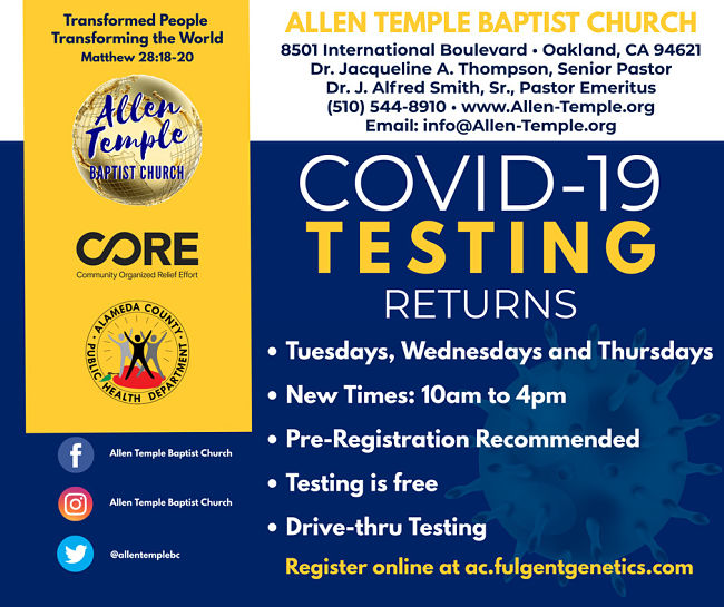 COVID-19 Testing is available at Allen Temple! Testing is available Tuesdays, Wednesdays and Thursdays from 10am to 4pm! Please encourage your family, friends and colleagues who are engaging public spaces and people consistently to be tested. Test results are available in 3 days. Appointments recommended; make yours at ac.fulgentgenetics.com. Let us remain diligent in following health and safety protocols that protect us!