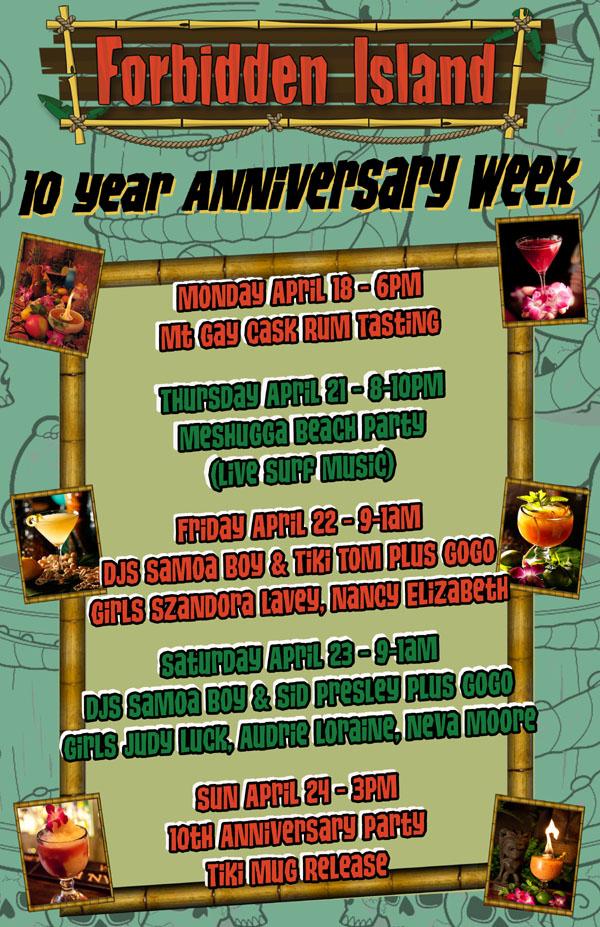 "strictly vinyl"  DJ shows with our resident DJs flanked with some of the best Go Go dancers on the West Coast! All this leading to the Main Event...our 10th Anniversary Celebration (Sunday April 24th, 3pm) with a traditional pig roast, a super limited edition Anniversary mug designed by Tiki Diablo and of course, celebratory cake!