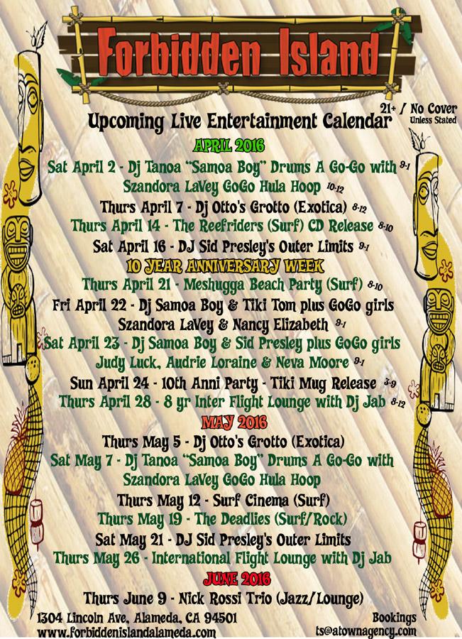 Fri April 22  - Dj Samoa Boy & Tiki Tom plus GoGo girls Szandora LaVey & Nancy Elizabeth - 9-1am