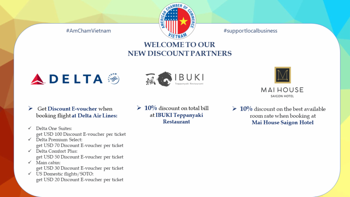 We are thrilled to extend a warm welcome to our new partners who have joined the AmCham Discount Program. With their participation, our members can enjoy exclusive discounts and special privileges when using their AmCham Membership Card on our Membership Discount Program. AmCham welcomes requests from all interested companies that would like to be apart of the program, and want to offer valuable discounts or savings on their products or services to about 2,000 individual business representatives of over 550 corporate members. You can fill out this Form to join us or contact amcham.membership@amchamvietnam.com for further information. | |