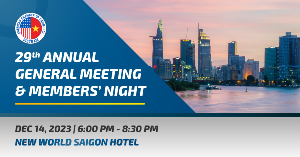 AmCham Vietnam is YOUR business organization. At our Annual General Meeting on December 14, AmCham leaders will update you on 2023 key developments and strategic results. The US Mission leader will highlight the partnership in 2023 between the U.S. Government and AmCham Vietnam. We will also announce the election results for the 2024-25 AmCham Vietnam Ho Chi Minh City Board of Governors.