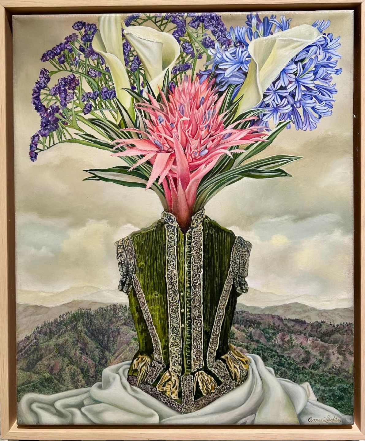 You would not know it from her work. The delicate brushwork that defies logic, the smooth silk finishes, the wispy feathers, blossoming flowers and corals, and the foliage, oh the foliage.
