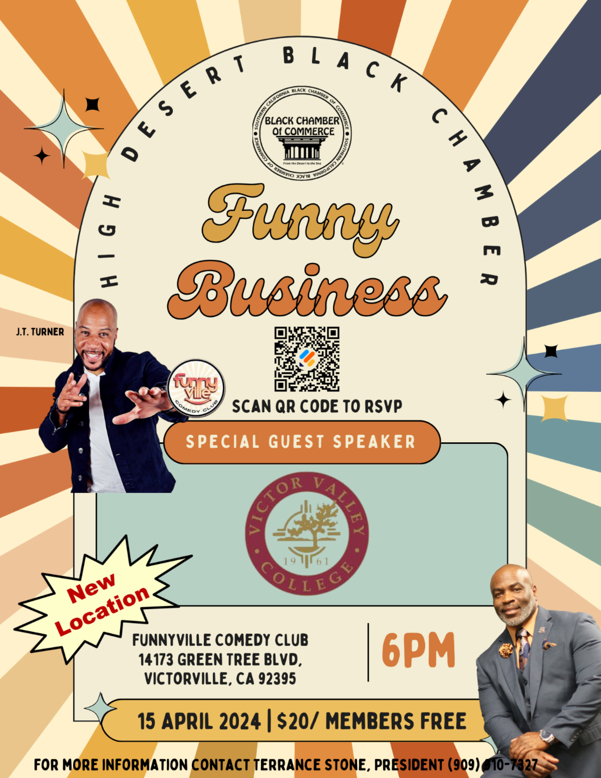 We are pleased to invite you to join us for the "Funny Business Mixer" event hosted by the High Desert Black Chamber of Commerce, which will take place on Monday, April 15th, 2024, at the FunnyVille Comedy Club located in the G T Hotels Inn & Suites at 14173 Green Tree Blvd, Victorville, CA 92395.