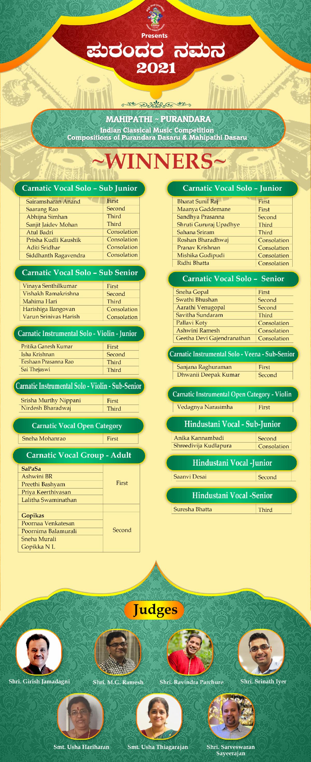 Smt.Chandrika, Smt. Shruti Jaidev Anand, Shri. Aditya Sathyanarayana, Shri. Shankar, Smt. Vaishnavi Anand, Smt. Janaki Sadagopan, Smt. Shamala Murthy, Shri. Salem P Sundaresan, Smt. Raksha Patil, Smt. Samuktha Murslu, Smt. Kavitha Balajee, Shri. N.N.Ganesh Kumar, Smt. Pratima Bellave, Dr. Bhagya Murthy, Smt. M.S. Vidya, Smt. Anuradha Chandramouliswaran, Smt. Padmini Srinidhi, Smt. Shruthi Raj, Smt. Gayathri Karthik, Smt. Rakhi Chatterjee, Smt. V.Jayalakshmi, Smt. Priya, Smt. Vidhya, Smt. Girija Venkataramani, Smt. Bhargavi Kulkarni, Smt. Shreevidya Subramanya, Smt. Kavitha Vasudevan, Smt. Lalitha Jayaraman, Smt. Meenakshi Somasundaram, Smt. Srividya Sriram, Smt. Annapoorna Shivram, Shri. Sundararajan, Smt. Raji Sekar, Shri. Garikapati Venkata Prabhakar, Smt. Lakshmi, Smt. Shyamala Sajnani, Smt. Ramya Harish, Shri. Srinath Iyer, Shri. Karthik M A, Shri. Bombay V Anand, Smt. Gayatri Sivaram, Smt. Shobha Raghu, Smt. Rasika Vishwanath, Smt. Aruna, Shri. Sushanth Parampad, Smt. Layana Sampath