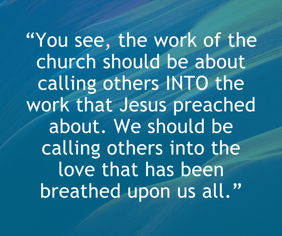 You see, the work of the church should be about calling others INTO the work that Jesus preached about. We should be calling others into the love that has been breathed upon us all. The mission of the church is to build up its members, the body of Christ, to be the best they can be: welcomed, loved, humbled, forgiven, freed from fear, healed, justified, and Spirit-filled. Then, together, the church goes out into the world to love it as Jesus would love: generous, loving, humble, forgiving, courageous, healing, just, and Spirit-filled.