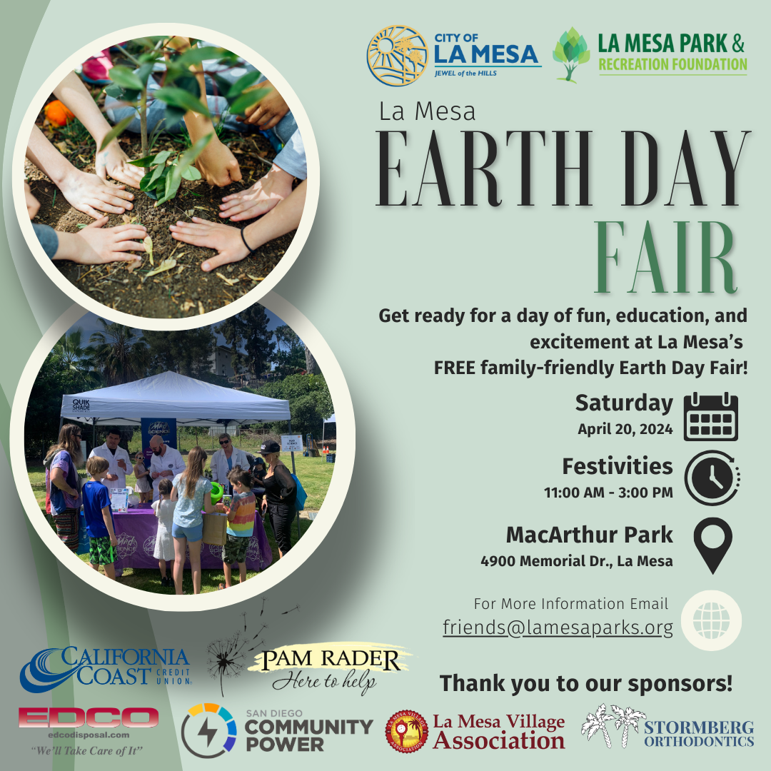 Thank you to our sponsors Pam Rader, Stormberg Orthodontics, La Mesa Village Association, San Diego Community Power, California Coast Credit Union, and EDCO for making this event possible. See you there!