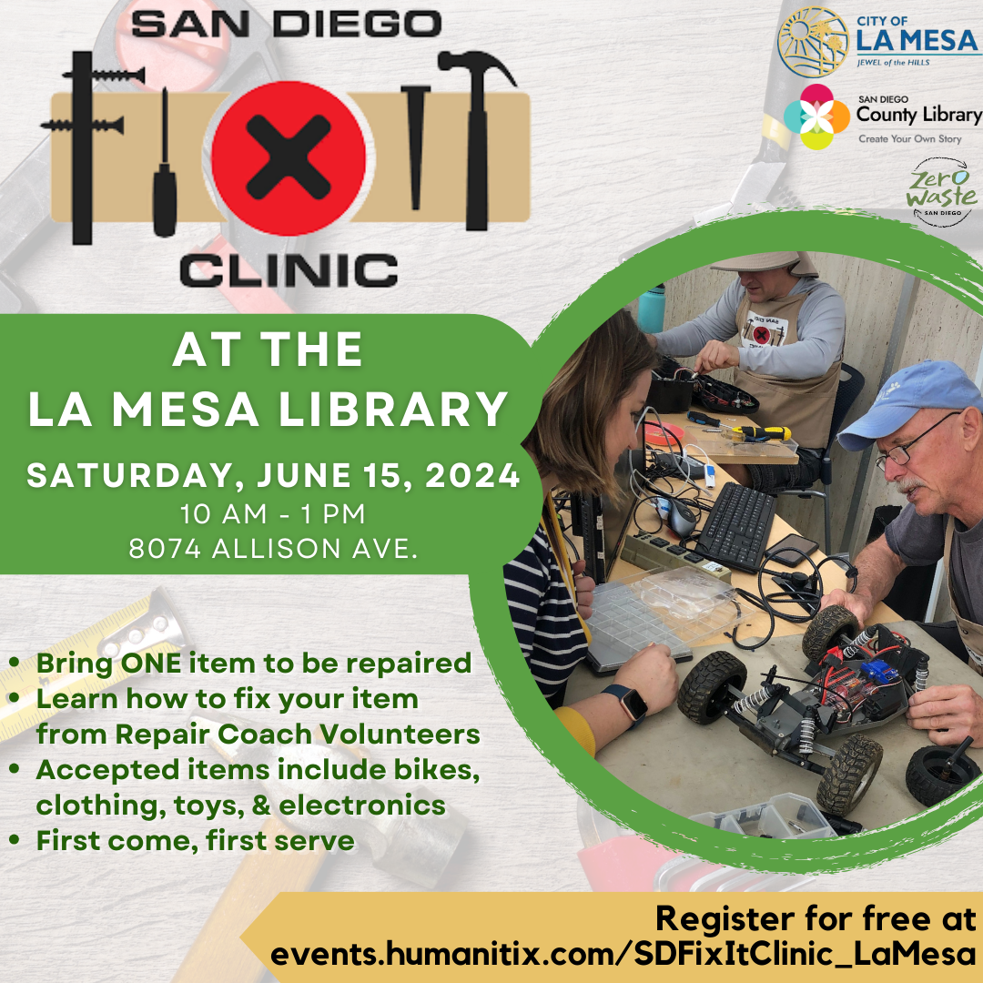 Bring your broken items for assessment and possible repair to the Fixit Clinic at La Mesa Earth Day Fair at the La Mesa Community Garden. Workspace, tools, and guidance will be provided. First come, first serve; registered participants are prioritized. |