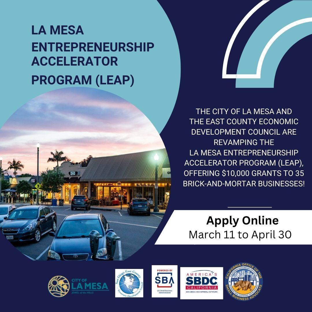 We’re now accepting applications for Cohort 3 of our successful La Mesa Entrepreneurship Accelerator Program. Thanks to funds from the American Rescue Plan Act (ARPA), 35 La Mesa businesses will get up to $10,000 per business in grant funding. The application deadline is April 30. | |
