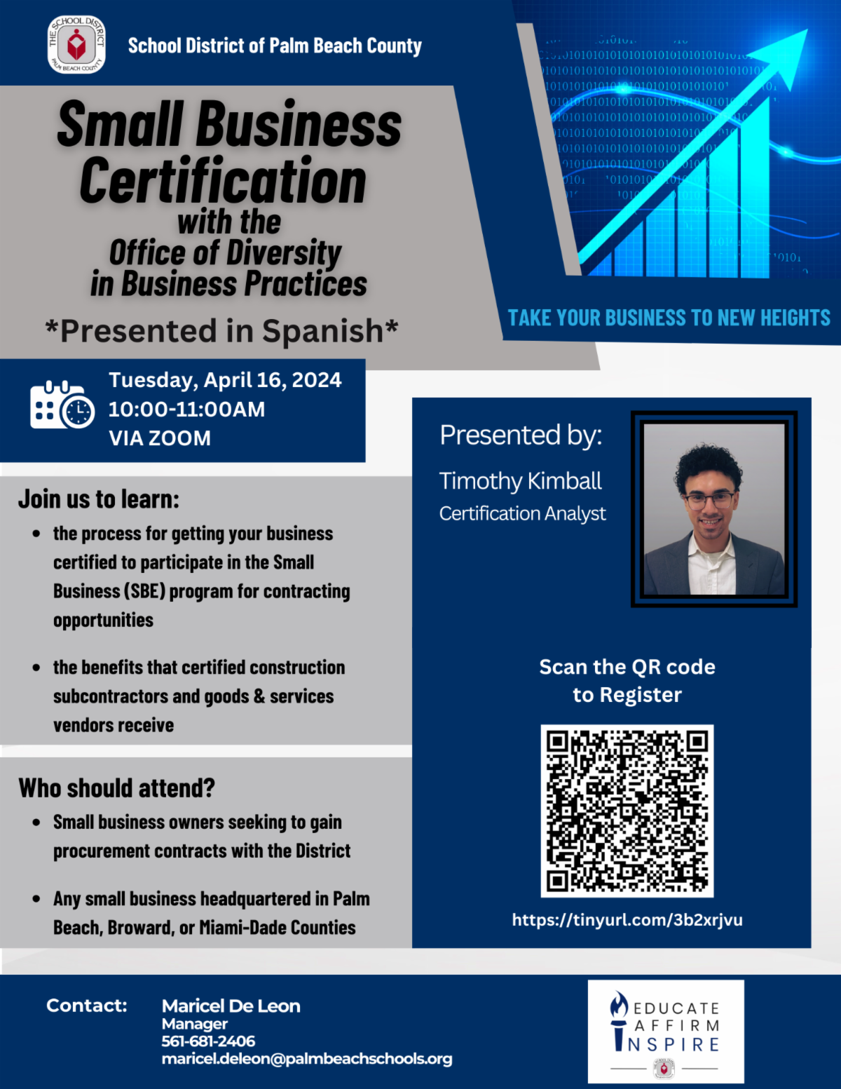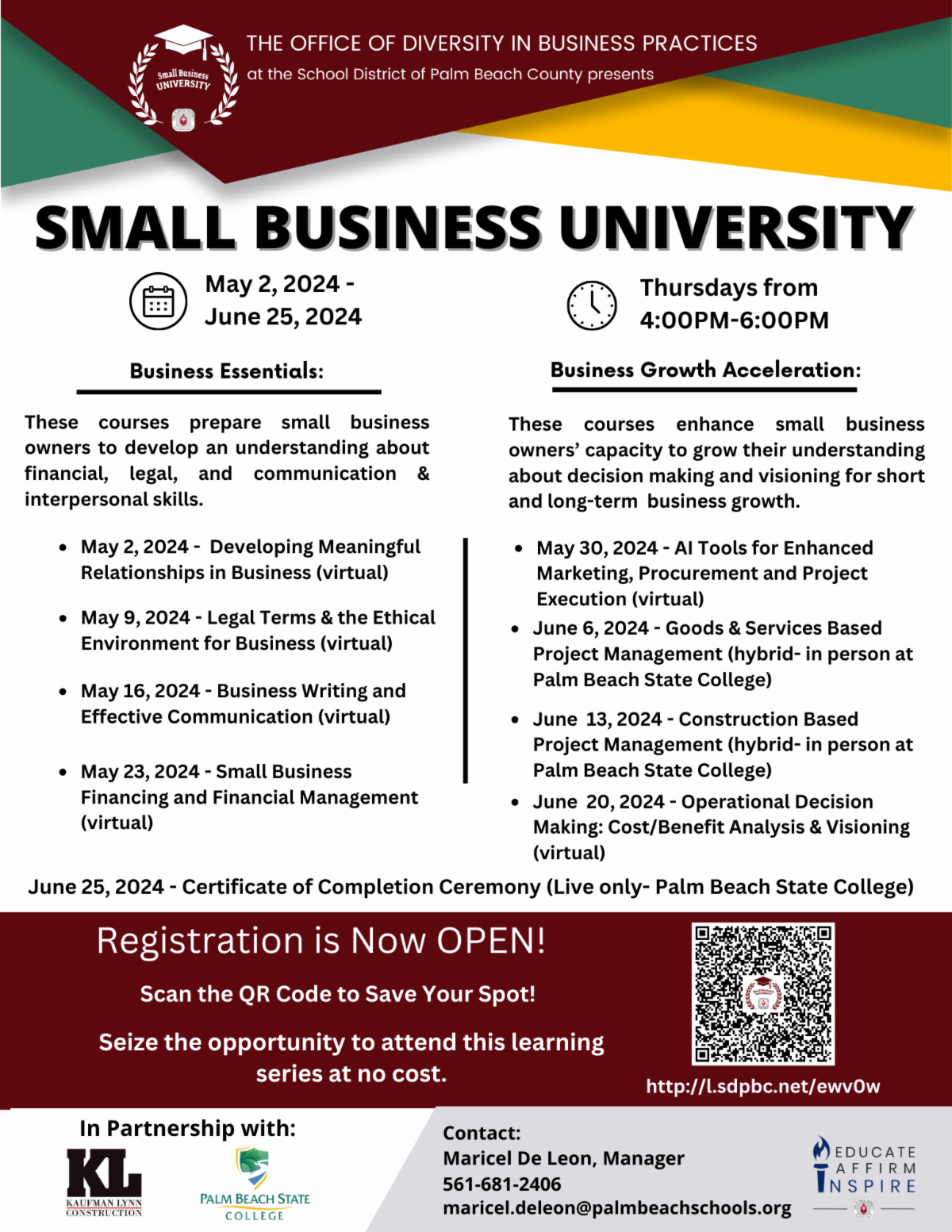 The Office of Diversity in Business Practices at the School District of Palm Beach County, in partnership with Kaufman Lynn Construction and Palm Beach State College, is proud to announce the seventh annual Small Business University. This eight-week learning series is provided at no cost. Participants will gain knowledge in essential business areas, including interpersonal and business communication skills, legal terminology and document comprehension, and critical financial management. Additionally, supplementary courses will focus on refining marketing and procurement skills using AI, improving project management expertise for goods, services, and construction projects, and concluding with business decision-making strategies. The courses will be held online, with some also in person, every Thursday from 4:00-6:00pm at Palm Beach State College starting May 2, 2024 through June 20, 2024. Please join us and learn how to grow your business!