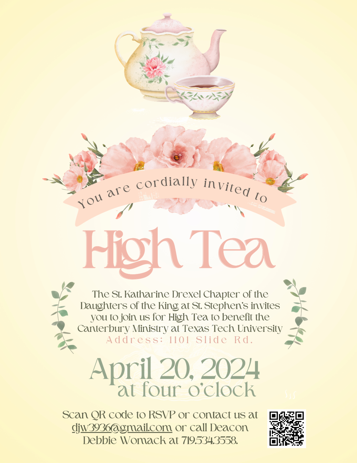 We invite you to dress up and step out for a fabulous afternoon of tea, clotted cream, scones, and more. MEN AND WOMEN FROM ACROSS THE DIOCESE ARE INVITED TO ATTEND!!! A prize for the best dressed will be given out. Remember your decorative hat or fascinator. There is no cost to attend this event, but we suggest a donation of $20 per person. All monies received will go directly to Canterbury. Please bring your donations to the event. You may pay by check, cash, or credit card. RSVP by scanning the QR code above, or click here. | |