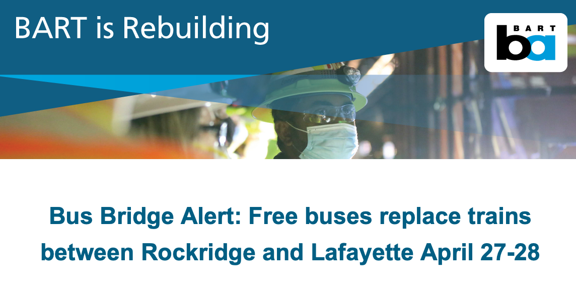 BART crews will work around the clock to advance several trackway improvements near Orinda Station on the weekend of April 27-28. To create a safe work space for the team, there will be no train service between Rockridge and Lafayette stations that weekend. Instead, free buses provided by AC Transit and County Connection will move riders between Rockridge, Orinda, and Lafayette stations. Orinda Station will be closed but buses will still serve the station. Riders can expect delays of 20-30 minutes in the work area on the shutdown weekend of April 27-28.