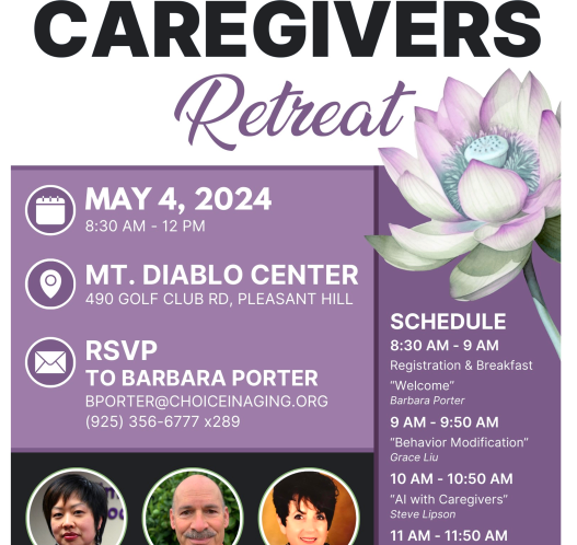 Free Caregivers Retreat at the Mt. Diablo Center, 490 Golf Club Road in Pleasant Hill, on Saturday, May 4 from 8:30 AM - 12 PM.