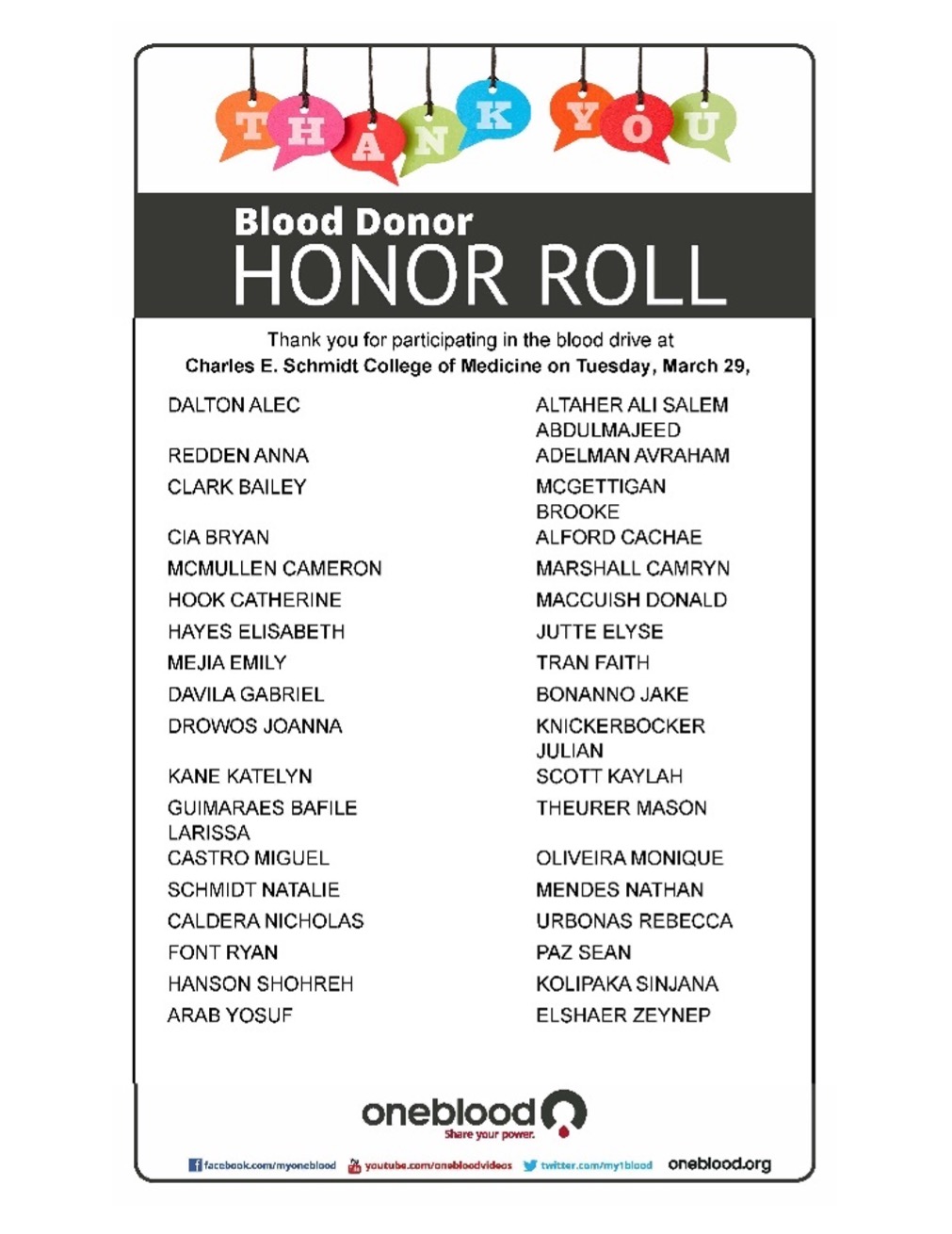 Congratulations to the FAU Pediatric Interest Group and the American Medical Student Association (AMSA) for hosting a successful spring blood drive last month. Thank you to Madison Goon and Atharva Rohatgi for organizing the drive. A total of 40 units of blood were collected, which equates to 120 lives saved. Special thanks to all of the donors and volunteers who participated in the blood drive.