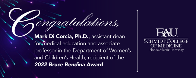 Mark Di Corcia, Ph.D., assistant dean for medical education and associate professor in the Department of Women’s and Children’s Health, who will receive the Bruce Rendina Award at the 2022 Heroes in Medicine banquet next month. This award recognizes an individual whose profession is an integral part of the healthcare system and has used their knowledge and abilities to improve the health of local, national or global communities in a tangible way even if they are not a direct provider of patient care. Congratulations to Dr. Di Corcia and special thanks to Mario Jacomino, M.D., for nominating him for this well-deserved award. The banquet will take place at Benvenuto’s in Boynton Beach on May 26, 11:00 a.m. - 2:00 p.m.