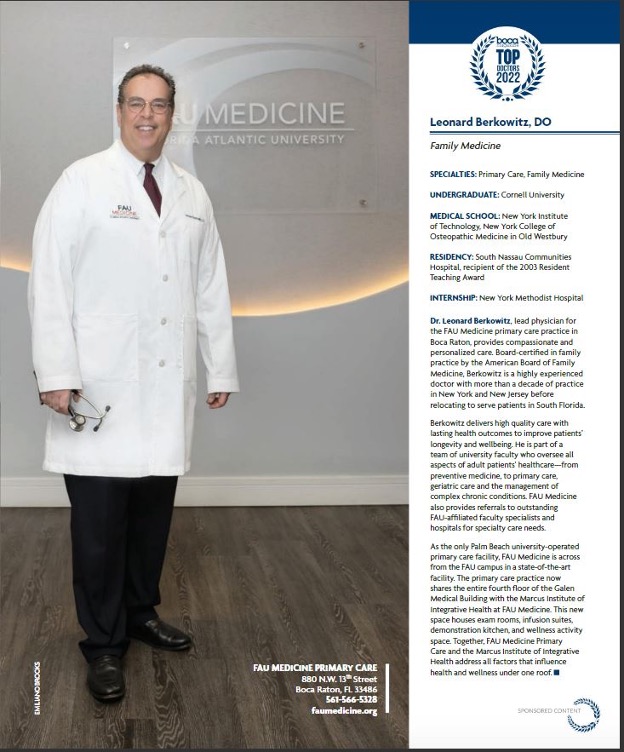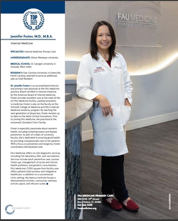 Jennifer Foster, M.D., M.B.A., a practicing physician at the FAU Medicine Primary Care practice; and Leonard Berkowitz, D.O., who leads FAU Medicine’s experienced team of physicians, were recently featured as “Top Doctors 2022,” by Boca Raton Magazine. Congratulations, Drs. Foster and Berkowitz!