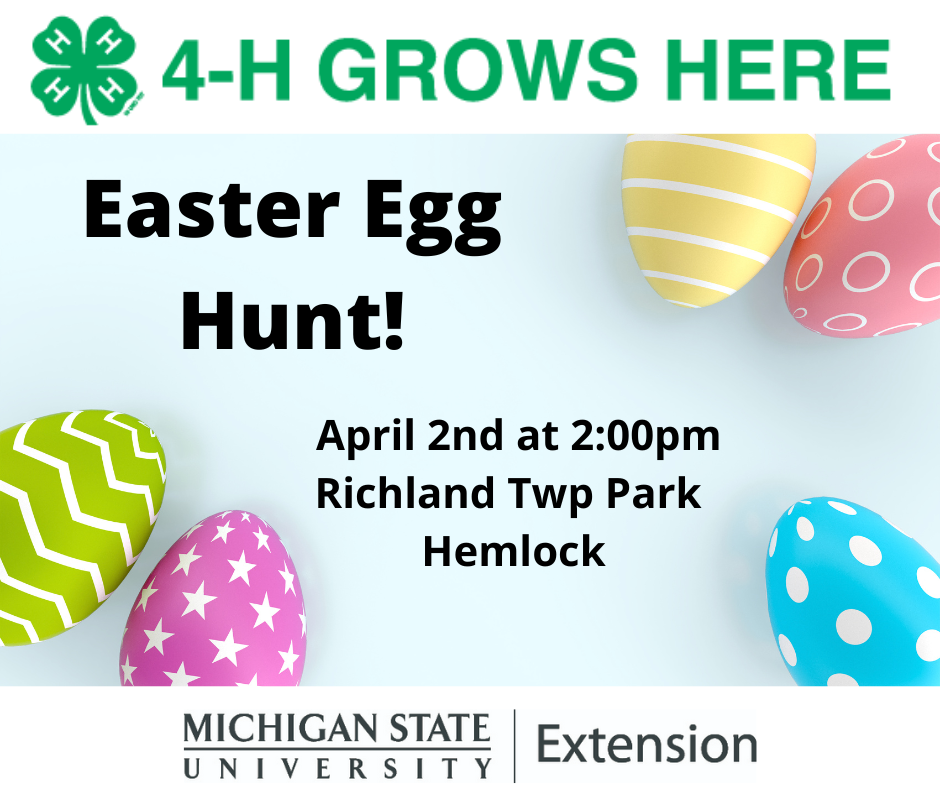 The Westsiders 4-H Club in Hemlock is hosting an Easter Egg Hunt on April 2 at 2:00pm at the Richland Township Park in Hemlock! The event is for ages 10 and under. Please do not arrive before 1:30pm. Hope to see you there!