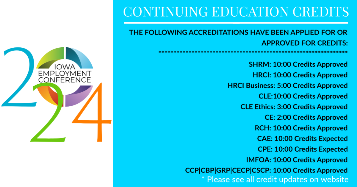 The mission of the Iowa Employment Conference is to deliver affordable conferences that provide the opportunity to develop professionally as well as receive continuing education credits through multiple professional associations such as: