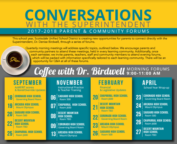 quarterly morning meetings with Dr. Birdwell, SUSD Superintendent & the 2 evening meetings. District & Arcadia Learning Community updates will be given, and parent attendance is an important part of helping our schools receive the attention they deserve.