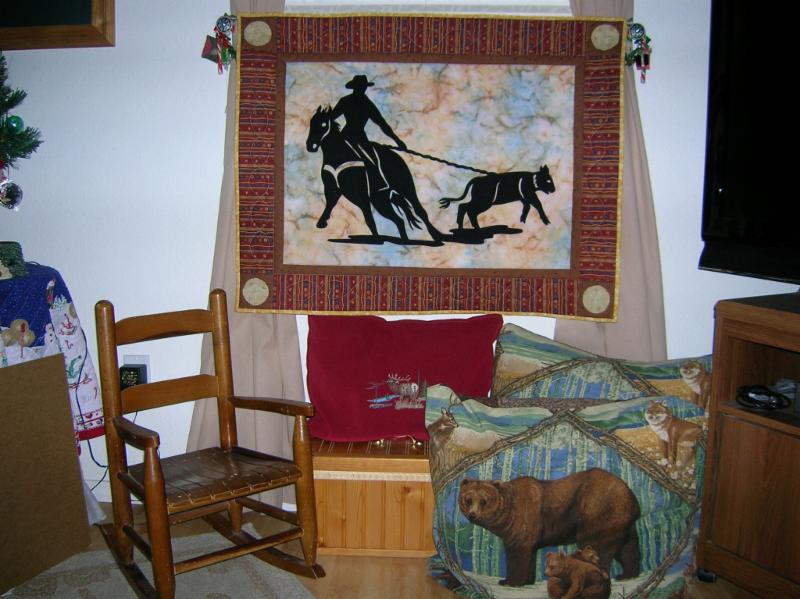 Good Catch - Purchased applique wall hanging, machine pieced and quilted This picture also shows a pillow I embroidered and two others that I pieced.