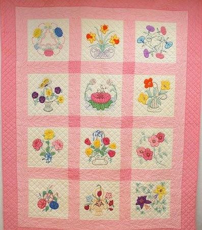 | HISTORY CORNER The Rainbow Quilt Block Company By Lenna DeMarco The beautiful ca 1935 quilt above, the blocks of which may look familiar to many of you, was created from the colorful designs of the Rainbow Quilt Block Company. Founded by William Pinch of Chicago in the 1920s it soon became one of the most prolific and familiar of the many pattern production companies of the era. Pinch was originally a photographer with an interest in art and design. For his company he advertised himself as a "Quilt Block Specialist" and a "Maker of Pretty Quilts". In a time of economic uncertainty, Pinch was innovative and marketed his more than 1000 designs in a variety of formats. Selling individually or in sets of 12 nine inch blocks he originally featured embroidery patterns for bears, kewpies, and Sunbonnet Sue or Dutch girls. Pinch printed the blocks in the colors that were to be used in the embroidery, hence the name "Rainbow". Sold in dry goods stores, as premiums for magazine subscriptions, and through the company, Pinch quickly expanded his designs to include state birds and flowers, baskets, fruits and numerous children's motifs. He also created blocks and kits that combined both applique and embroidery, as is seen in the quilt above. These blocks were generally 12-18 inches and stamped on a good quality muslin. The kits included embroidery floss and the cotton used in the applique. Ever creative and resourceful Pinch invited customers to send in their own cotton blocks printing. At half the price he even included the applique pieces! Rainbow Quilt Blocks were most popular throughout the 1920s, 30s, and 40s. Their popularity spawned numerous knock-offs and it is often difficult to discern if a block design is really a Rainbow or a competitor's. Pinch's daughter continued the company well into the 1970s and the next generation has carried it on into the 21st century. While many of the blocks and patterns are available on line through The Rainbow Quilt Block Company LLC, originals often turn up on EBay or in antique shops. Quilt historian Sharon Pinka has researched and written extensively on the Rainbow Quilt Block Company. If you'd like to learn more be sure to attend the March 21, 2015 AZ Quilt Study Group Regional Day meeting in Phoenix where she will be the key note speaker. Go to www.azquilthistory.org for information and registration forms. The deadline is March 17. |